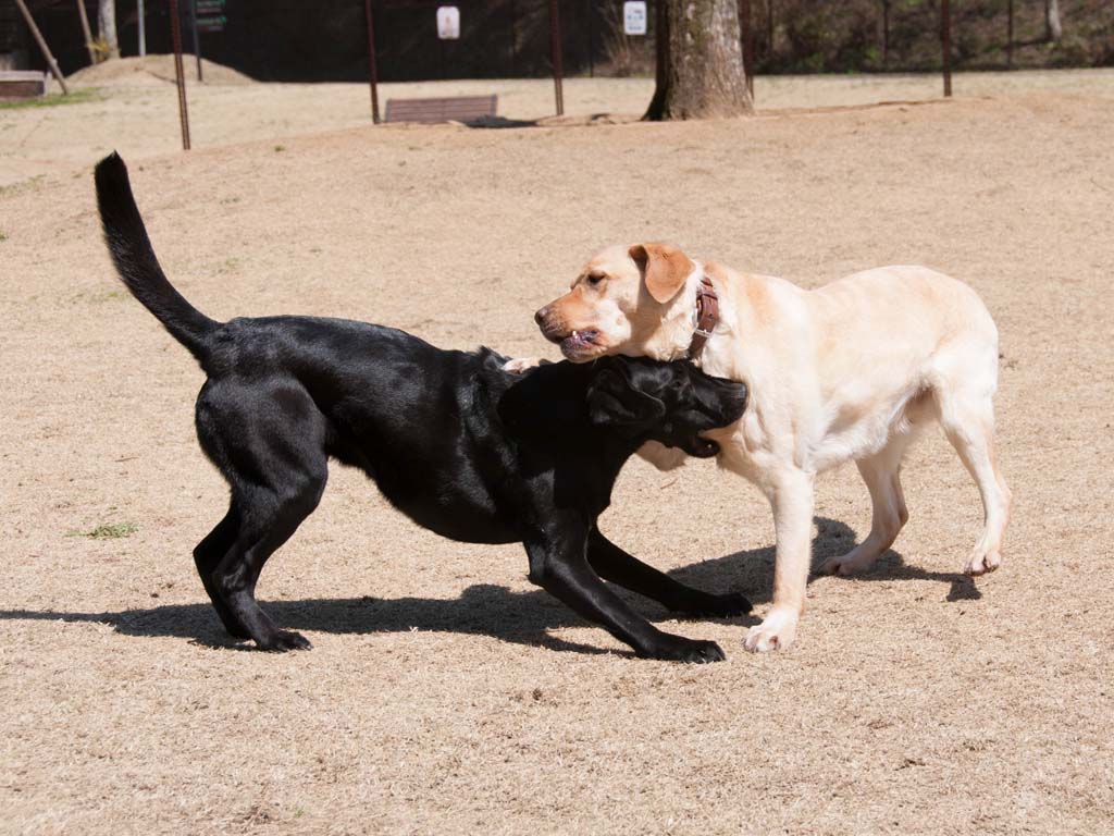 散歩で出会うといつも飽きることなく取っ組み合いをするケンタとカリブが、ドッグランではあまりしません。