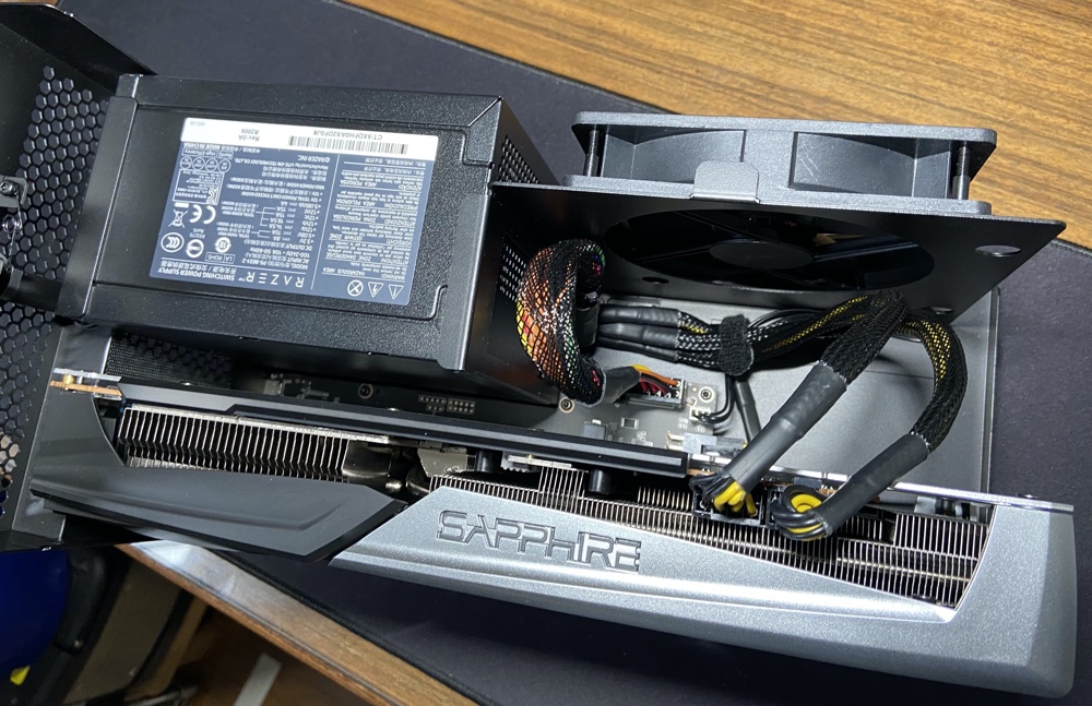 eGPUボックスとして今回選んだのは、比較的安価で電源とサイズに余裕のある Razer Core X です。スチール製の筐体なのでかなり重いです。でも500Wをビデオカードに供給できますし、ほとんどのサイズのビデオカードを装着できるフルレングスです。