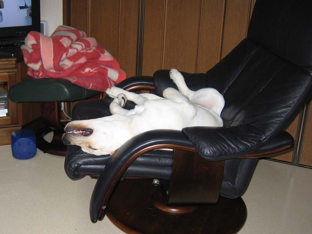 寝姿は一番写真に撮りやすいシーンです。ケンタは仰向けで寝るのが好きで、暖かくてリラックスしている時はよくこの姿勢で寝ています。子犬の時に大好きだった安楽椅子もケンタが成長するにつれて小さくなり、落ち着いて寝転ぶこともできなくなってしまいました。そこでケンタ専用の安物の二人掛けソファを購入しました。
